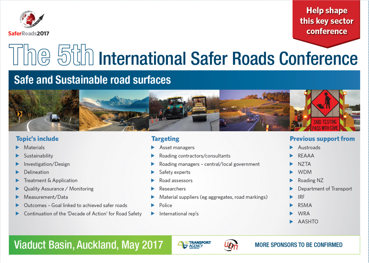 The 5th International SaferRoads Conference will be held in Auckland, New Zealand, in May 2017.