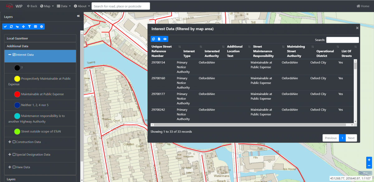 Within the mapping software, a range of layers can be set up which can be used to help break down data into an easy-to-read format. These layers can be used to colour code ESUs, asset types (such as road type) and owner types – as the data changes so do the layers. Support for imported layers to show alongside NSG data in the map is included, for example, parish, district, and authority polygons.