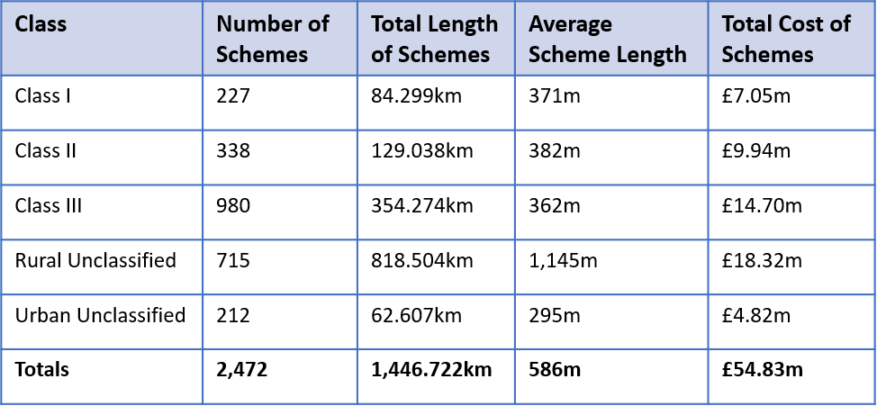 Once a list of potential schemes has been identified, provisional costs can be identified for the schemes giving an appreciation of the programme of works required to maintain a level of service to road users. These indicate the value of work that is required to treat all lengths of roads within the authority that have been identified as defective.