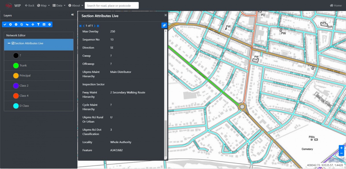 Network details can be edited either using map-based visual or locational co-ordinates or by entering known section codes. Individual section attributes such as speed limits or maintenance hierarchies can be quickly updated on the live hosted network. New sections can be added and digitised assisted by using the available map backgrounds and sections can be end dated whilst retaining all historical survey records.