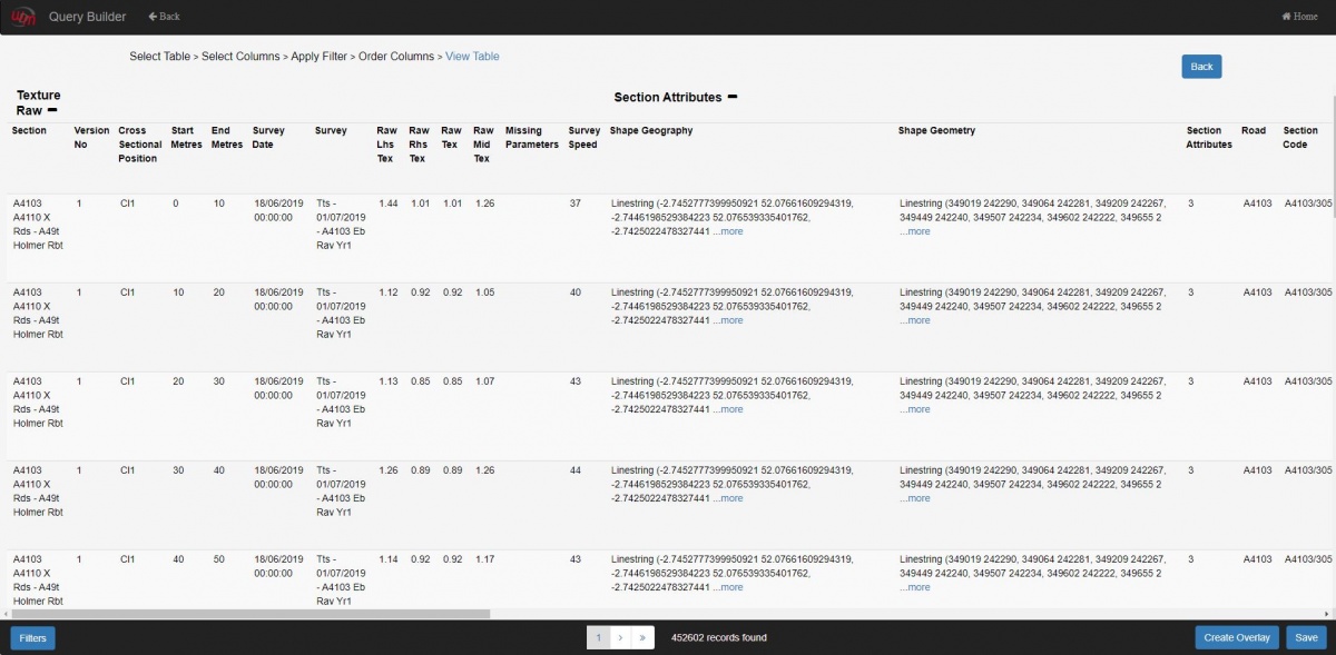 Querying and extracting survey data from the PMS/UKPMS is carried out using the Web Query Builder (WQB). All current and historical survey data and other asset information held in the hosted database can be extracted via the WQB which includes extensive filtering options to enable the extraction of the specific data that the user requires. The data can be viewed and also extracted in cxv, Excel or GIS formats.