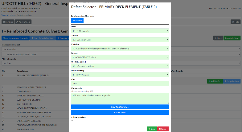 The Structure summary data is displayed pre and post survey, allowing the inspector to review and amend values including Inspectors and Engineers Comments. The span length, width and area are automatically populated from the W.D.M. Limited Structures Management Database. Options are provided to transfer images between the Structures Management System and Web Structures Inspection providing the inspector with information at his fingertips.